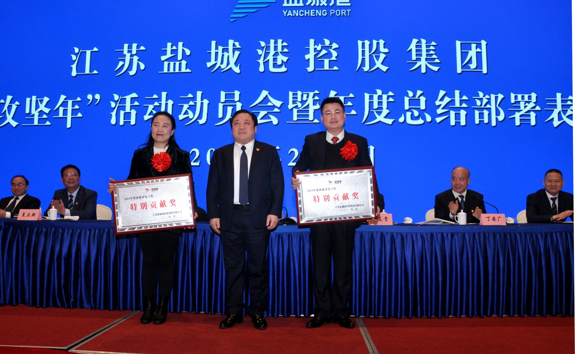会议为2021年度集团受表彰的先进集体、先进个人、卓越工匠以及营销标兵代表进行了颁奖,大丰海港控股集团、滨海港开发集团、国际陆港集团、项目建设管理公司、集团企业管理部分别围绕主题作了表态发言。
