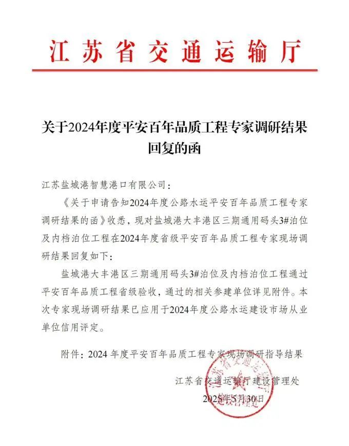 近日,省交通运输厅公布2024年度“平安百年品质工程”专家现场调研指导结果,盐城港大丰港区三期通用码头3#泊位及内档泊位工程成功通过,标志着盐城港在省级“品质工程”创建领域取得了历史性突破。