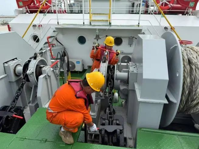 拖轮作业的成败始于精细准备。作业开始前,盐城港拖轮服务公司全面结合船舶吨位、潮汐数据及码头环境,联动引航站,依托智能化系统制定最优作业方案;严格全面排查主机、舵系、缆绳等关键设备,确保“零隐患”运行;实时追踪风浪、能见度及洋流变化,动态调整作业窗口期,在极端天气下坚决坚持“宁停三分,不抢一秒”原则。此外,组织全员进行方案推演,明确拖带点位、通讯指令及应急预案,将安全标准渗透至每个环节,为高效协同奠定基础。