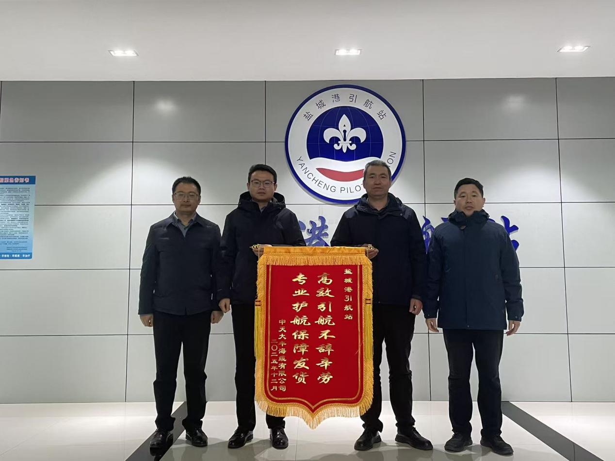 近日,中天大丰海缆有限公司代表将一面绣有“高效引航不辞辛劳 专业护航保障发货”的鲜红锦旗送到盐城港引航站,向引航站一年来在船舶引航事业中的不懈坚守与专业服务表达由衷感谢。这面锦旗不仅是对引航站工作的高度认可,更是对其全年践行“安全引航、服务至上”理念的生动见证。