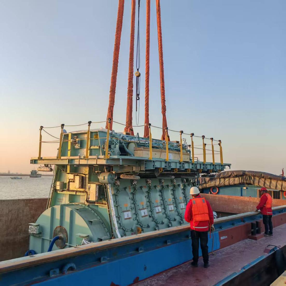 此次集中作业期间,港区陆续完成了两台总重349吨的船舶内燃机、一台405吨发电机、一套280吨发电机组以及两套总重380吨设备的接卸任务。面对船舶集中到港、货种复杂多样的挑战,响水港区生产团队提前部署制定个性化的工艺方案,科学调配吊装资源。针对变压器等精密设备,专项采取低速平稳平移、多点立体防护、全程实时监测等精细化举措,全方位保障货物完好无损、作业安全零事故,以专业实力赢得了新老客户的高度认可与广泛赞誉。