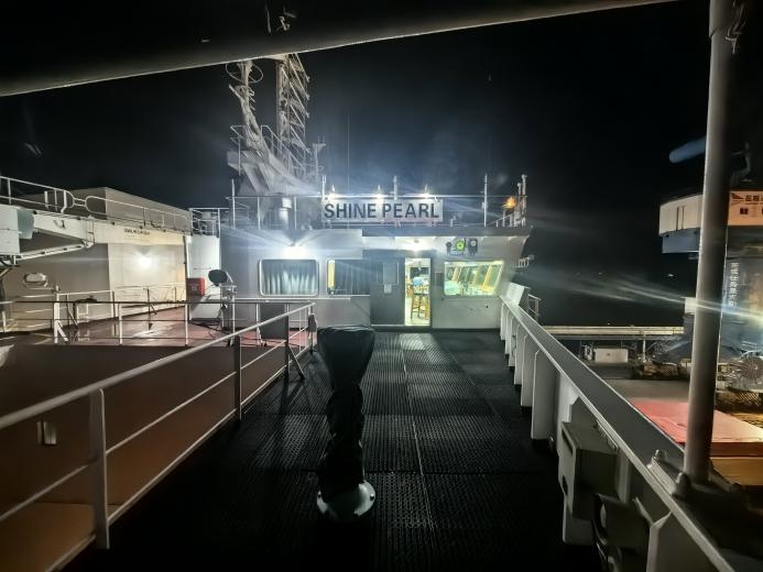 三时三十分,引航员准时登轮。登轮后半小时,海浪如预判般逐渐消退,引航员顺势而为,巧妙利用潮汐变化,通过稳健指挥与精准操纵,在涌浪间隙中稳控巨轮航向。历时一个半小时,“闪耀珍珠”轮最终顺利靠泊,全程未受风浪影响。“你们的业务水平是一流的!感谢克服不良海况引领我轮准时靠泊!”船长由衷赞叹。这声感谢,是对引航员深夜坚守的最好回应。