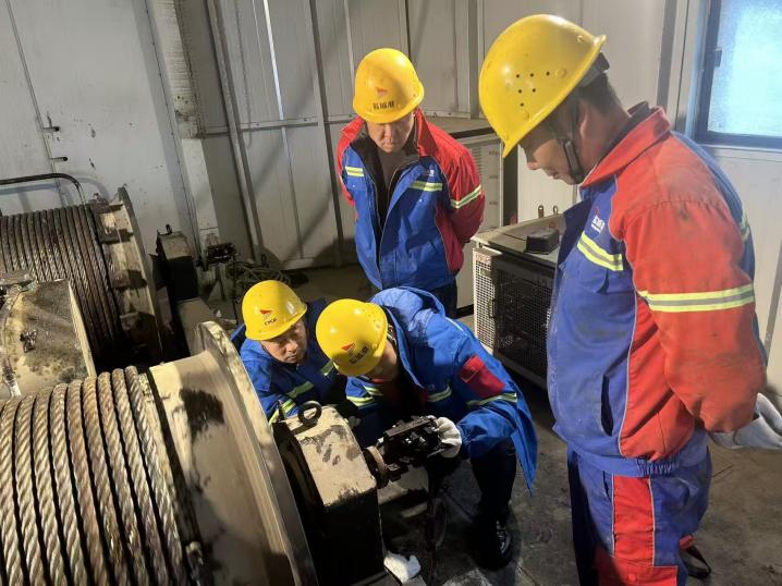 本次设施维保由机修组、门机组牵头组织,港区在岗一线人员全员参与。在高耸的门机象鼻梁处,技术人员不惧登高、精细作业,针对长期受粉尘侵蚀、设备振动影响的监控摄像头,逐一开展检修调试,彻底解决信号不稳、视野模糊问题,确保门机操作全程无死角、视野清晰可控;门机平台上,号子声铿锵有力,旧钢丝绳在规范操作中平稳卸下,崭新钢索在众人合力牵引下精准落位,每一步都严谨规范;后方皮带线沿线,检修班组分段布控、逐点排查,对托辊、接头及防护装置进行全面紧固更换,不放过任何一处细微隐患。维保现场,老师傅俯身卷筒旁精准校准钢丝绳张力,青年职工主动配合、协同调整,新老搭档默契配合,各道工序环环相扣、井然有序,尽显专业素养。